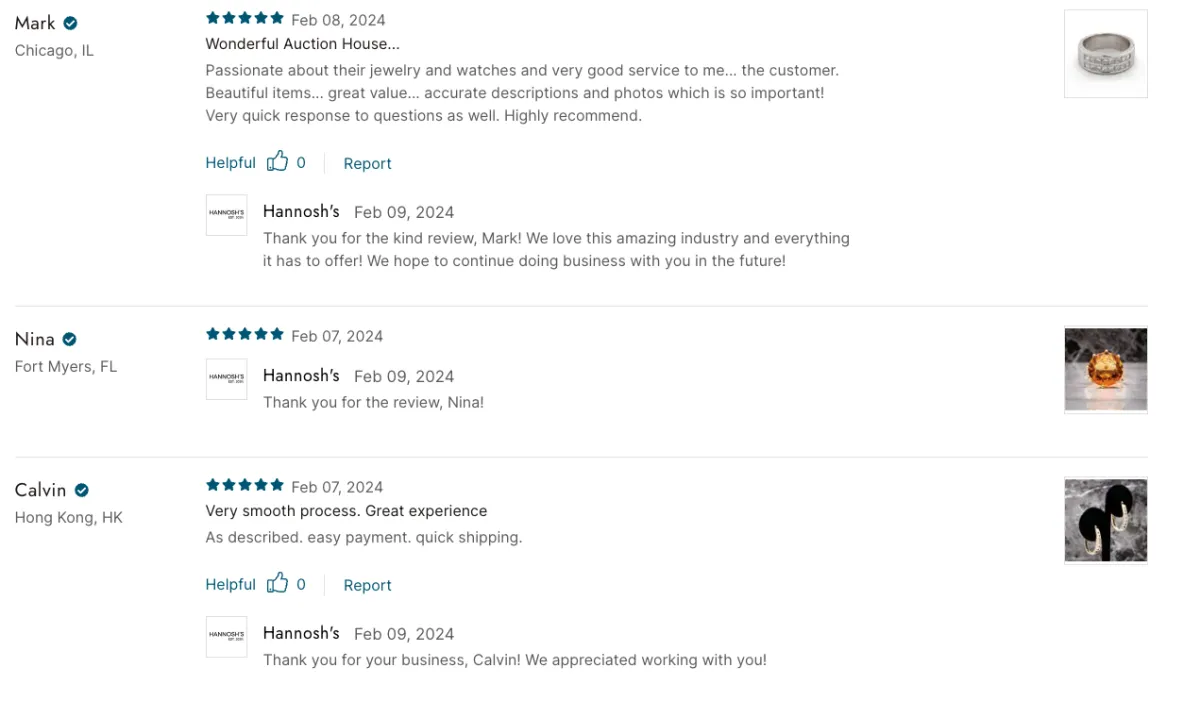 "Experts at Hannosh's demonstrated impressive knowledge and provided an honest transaction. They appraised my jewelry with accuracy and offered a fair price. Their professionalism is commendable."